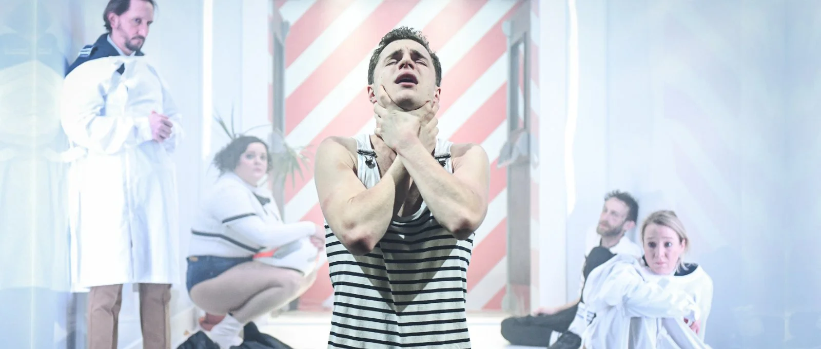 Oba muži sedí v bílé sterilní krychli znázorňující Édouardův pokoj a přes hmatatelnou vzájemnou přitažlivost se mezi nimi otvírá propast. Snad právě proto, že se v interakci téměř ani jednou nedotknou. Fyzickou blízkost zprostředkovávají předměty, které nesou ambivalentní významy. Šťavnatá broskev, do níž se najednou zakousávají, se postupně proměňuje v symbol násilí – Reda plive kousky na zem a Édouard do publika stříká parfém se syntetickou broskvovou vůní, kterou intenzivně cítil se zabořenou hlavou v polštáři při aktu znásilnění. Obvazy na rukou působí jako svůdný drsňácký look pokérovaného Redy, mění se v laso, jímž Reda chytá a omotává Édouarda, který se sám zaplétá do řetězce činů, jež jej vedou téměř až za hranu života. To vše režie zachycuje v dynamických střizích za doprovodu gradující maghrebské hudby v živé kompozici Iva Sedláčka. Materialita útočí na všechny smysly diváka a dává na srozuměnou nejednoznačnost lidských vztahů vzpírající se černobílému scénáři, který hledají policisté.