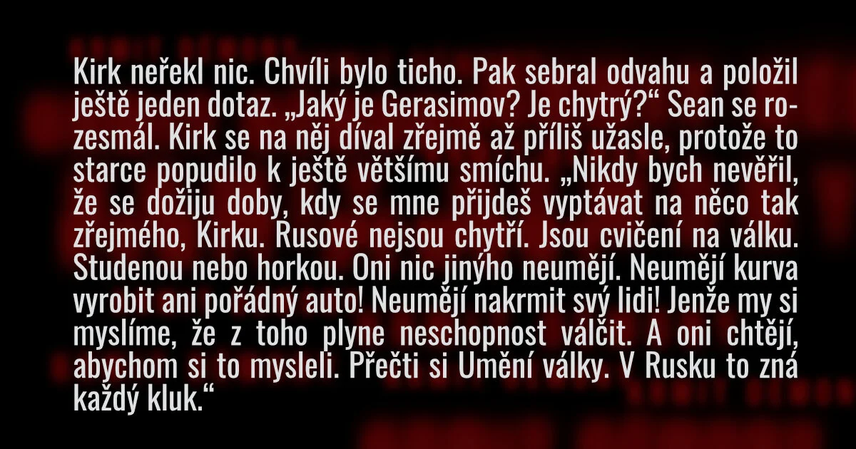 Kniha není černobílá pouze při popisu postav, ale vybízí čtenáře, aby touto perspektivou nahlížel na celý svět. Praha devadesátých let je například v jedné pasáži vykreslena jako zkorumpované místo ovládané ruskými mafiány. Co by se dalo omluvit jako snaha o vytvoření kontextu pro představení některých postav, již lze sotva pominout u (z hlediska děje víceméně nesmyslného) exkurzu do konfliktu na východní Ukrajině. Ten je z komplexního mezinárodněpolitického střetu redukován na dlouhodobě připravovaný útok Ruska na mírumilovnou Ukrajinu. Obecně náhled na Rusy naplňuje ty nejotřepanější stereotypy. V knize se jedná nejen o inherentně agresivní, ale zároveň po všech stránkách primitivní a zaostalý národ, který tak představuje ideálního antagonistu Západu a jeho hodnotám. Koneckonců i při jedné z charakteristik prezidentského kandidáta Kempa zazní, že „byl kupodivu povahou víc Rus než Američan. Náladový, násilný, chvástavý, s poruchami pozornosti a závislostí na amfetaminech“.